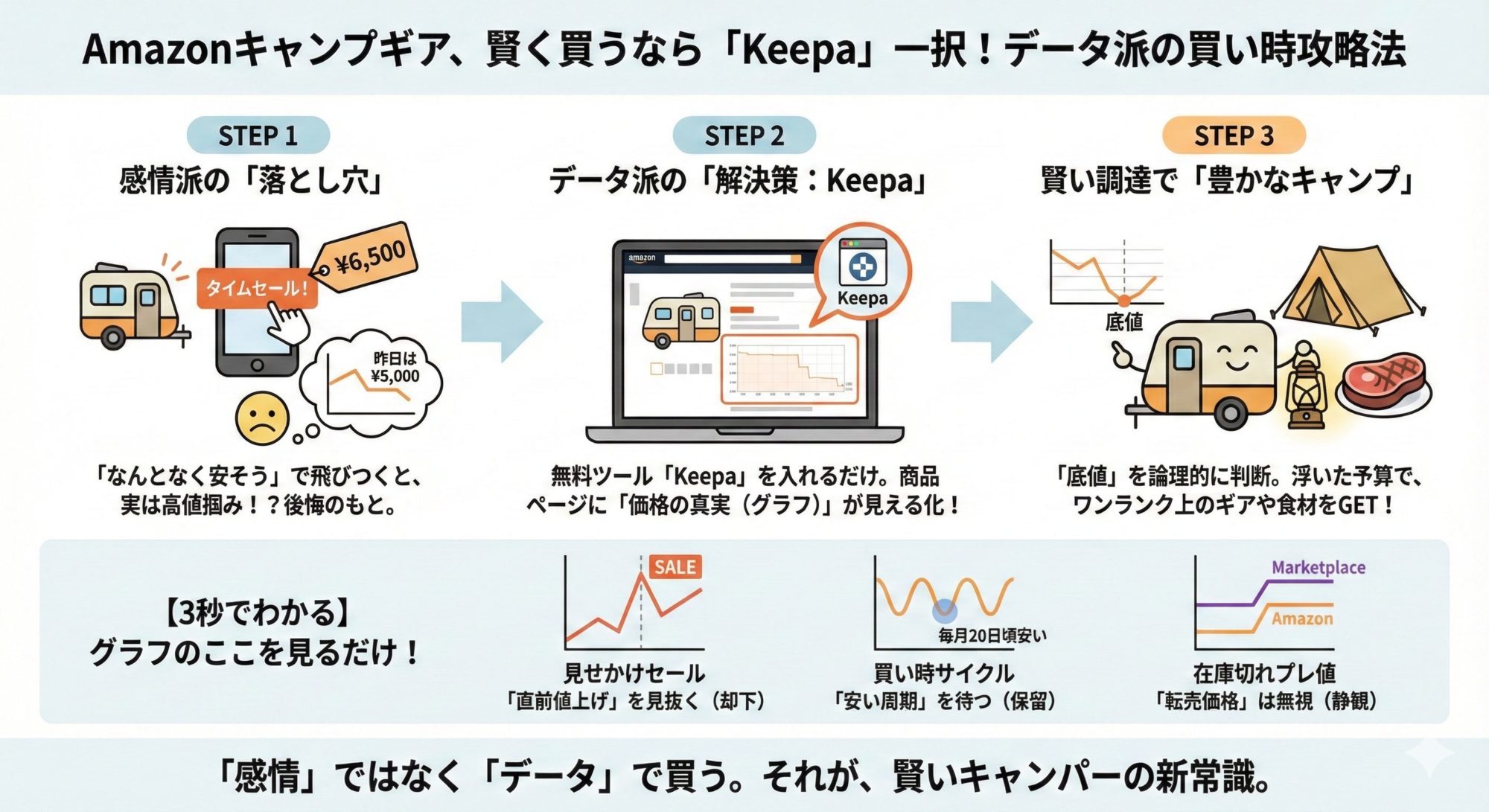 キャンプギア、特にテントや高機能なチェア、焚き火台などは数万円単位の出費になります。しかし、Amazonの価格設定は高度なアルゴリズムによって自動的に変動しており、人間の感覚だけでは「今が安いのか」を判断するのは困難です。